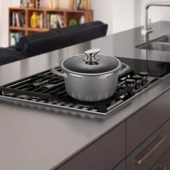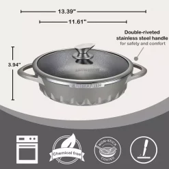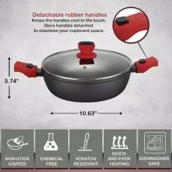 Scratch-resistant 10 in., 4.5 litre non-stick casserole with glass lid, with long-lasting Greblon C2+ nonstick coating on a base of forged aluminum. Greblon C2+ is a high-quality double-layer ceramic nonstick coating for cookware. Not only does it make cooking a pleasure (who doesnβt love to see their perfectly cooked meal slip right off the pan onto the plate), it also makes cleaning up quick and easy. The true genius of this nonstick ceramic casserole lies in the detachable handles: rubber keeps the handles cool to the touch, but best of all, the fuss-free detach function means you can remove handles before placing the casserole in the dishwasher, then store handles inside the casserole to maximize your cupboard space. The aluminum core is energy efficient to ensure even heat distribution and avoid hot spots. Our cookware is BPA free, with abrasion resistance and corrosion resistance to ensure you many years of stovetop use. Suitable for all hobs and ranges, including induction heating. Dishwasher safe: just remove the easily detachable rubber handles before washing. Length 22.83 in. x W 11.02 in. x H 19.68 in. This product comes with a 2-year manufacturer warranty.