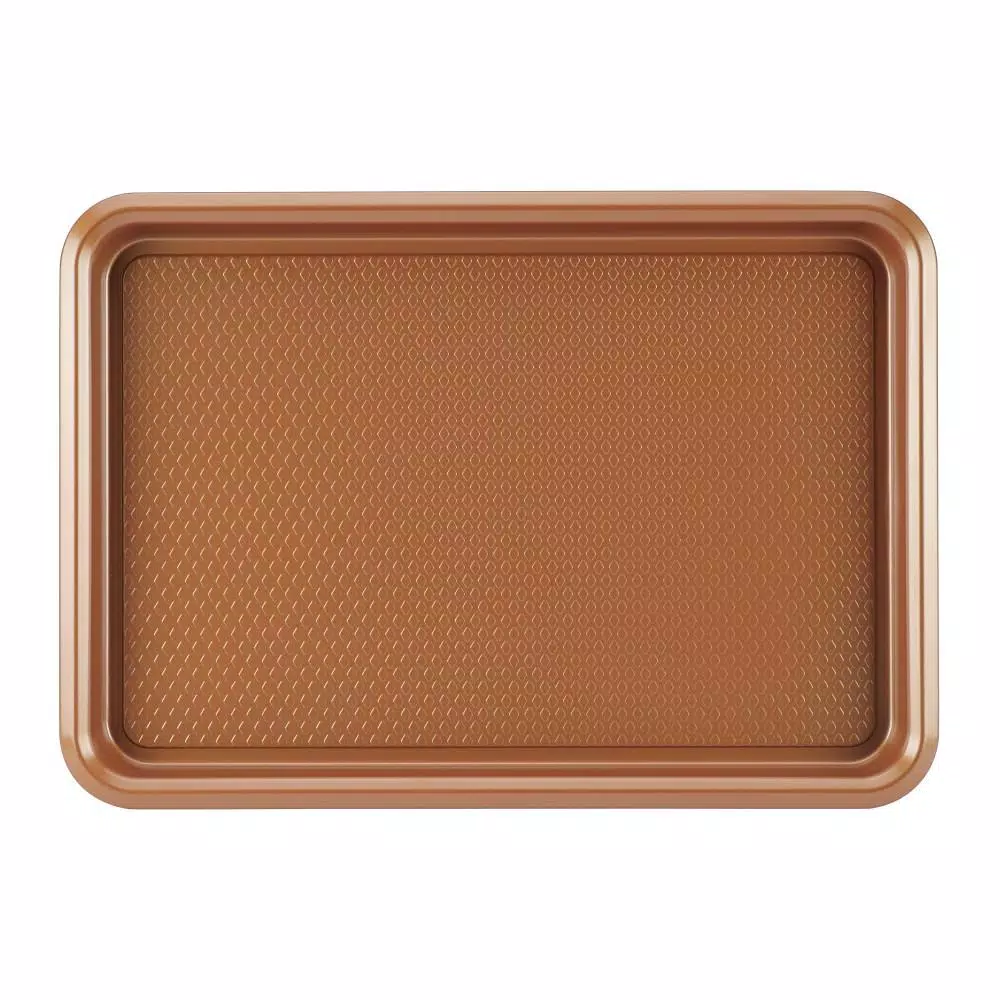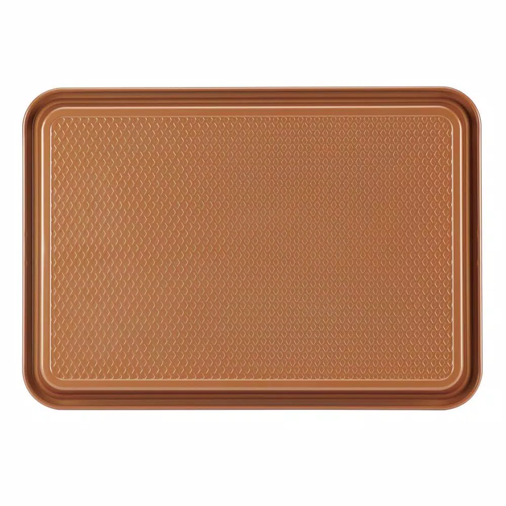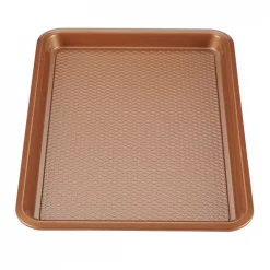 Make a triple play of oven-baked chicken tenders, soft and chewy chocolate chunk cookies, and a family sized batch of loaded potato jackets using the Ayesha Bakeware Nonstick 3-Piece Cookie Pan Set.Constructed from durable, high-performance steel, this set of cookie pans in three essential sizes boasts excellent resistance to warping and bending for great results, recipe after recipe. A textured diamond pattern assists with both enhanced browning and easy food release, so buttery baked goods brown evenly and donβt stick to the pan. Extended edges provide a sure and sturdy grip for pulling a batch of crispy French fries off the center rack or for tossing broccolini in mid-roast. Oven safe to 450F, the cookie pans are suitable for a wide range of sweet and savory recipes, and feature a high-quality nonstick coating for healthy cooking and long-lasting performance. Theyβre dishwasher safe, too, so weeknight meals and signature recipes like Ayeshaβs Brown Sugar Bacon Bites turn out Instagram-ready with easy cleanup (hand wash recommended to prolong product life). Plus, this Ayesha Curry kitchenware helps support No Kid Hungry to provide up to 500,000 meals to children in need. Learn more at nokidhungry.org/onedollar.Grab your Ayesha Cookie Pan triple pack today and unleash the stylish simplicity in your baking.