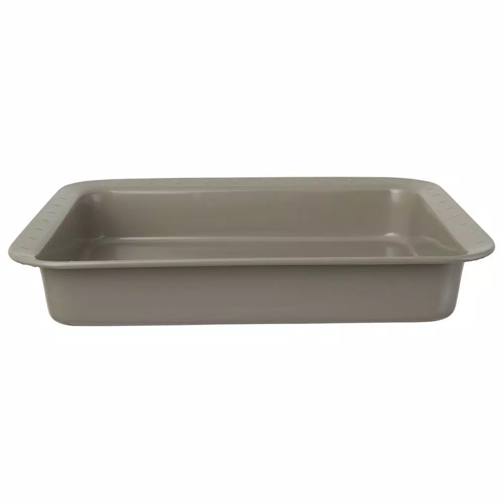 This rectangular cake pan from the Leo Collection is more than just your standard bakeware, itβs also a handy way to ensure your cakes and brownies are perfectly sliced, every time. Cleverly designed guidelines built into the pan will help you line up the included slicing tool, guaranteeing your sweet treats are flawlessly portioned. The pan is made from durable, long-lasting carbon steel, and the included cutting tool wonβt scratch or damage your bakeware. Includes a non-toxic, fernogreen non-stick coating. Hand wash recommended.