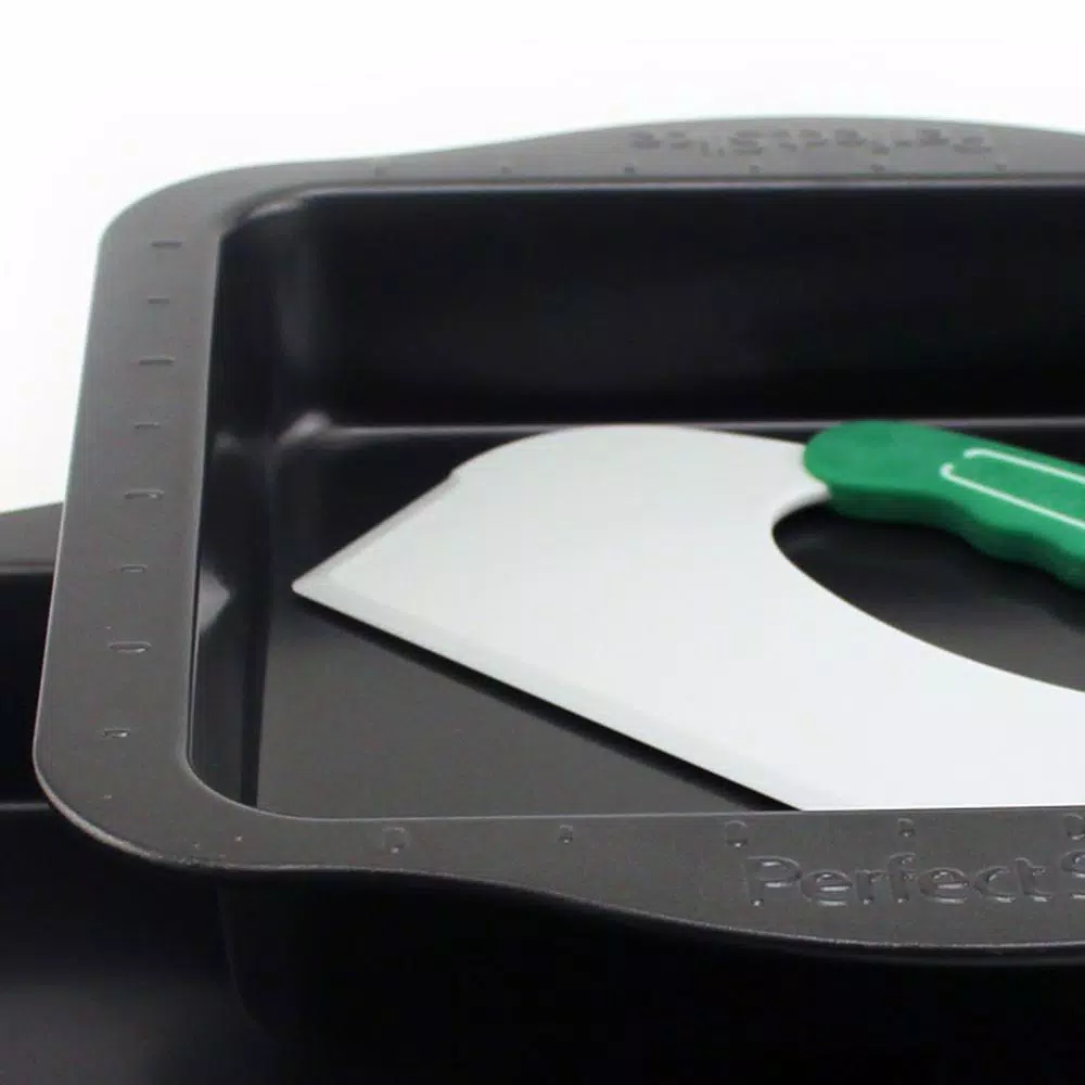 This Perfect Slice cake pan set is more than just your typical baking pan set. itβs also a convenient way to ensure your cakes and brownies are perfectly sliced every time. The unique guideline grid around the outer edges of the pans allows you to easily line up the included Perfect Slice cutting tool and cut the perfect portion size. Make perfectly-sized slices every time. Dishwasher safe.