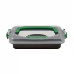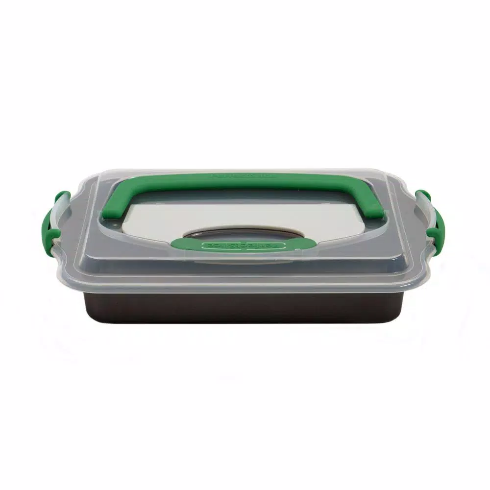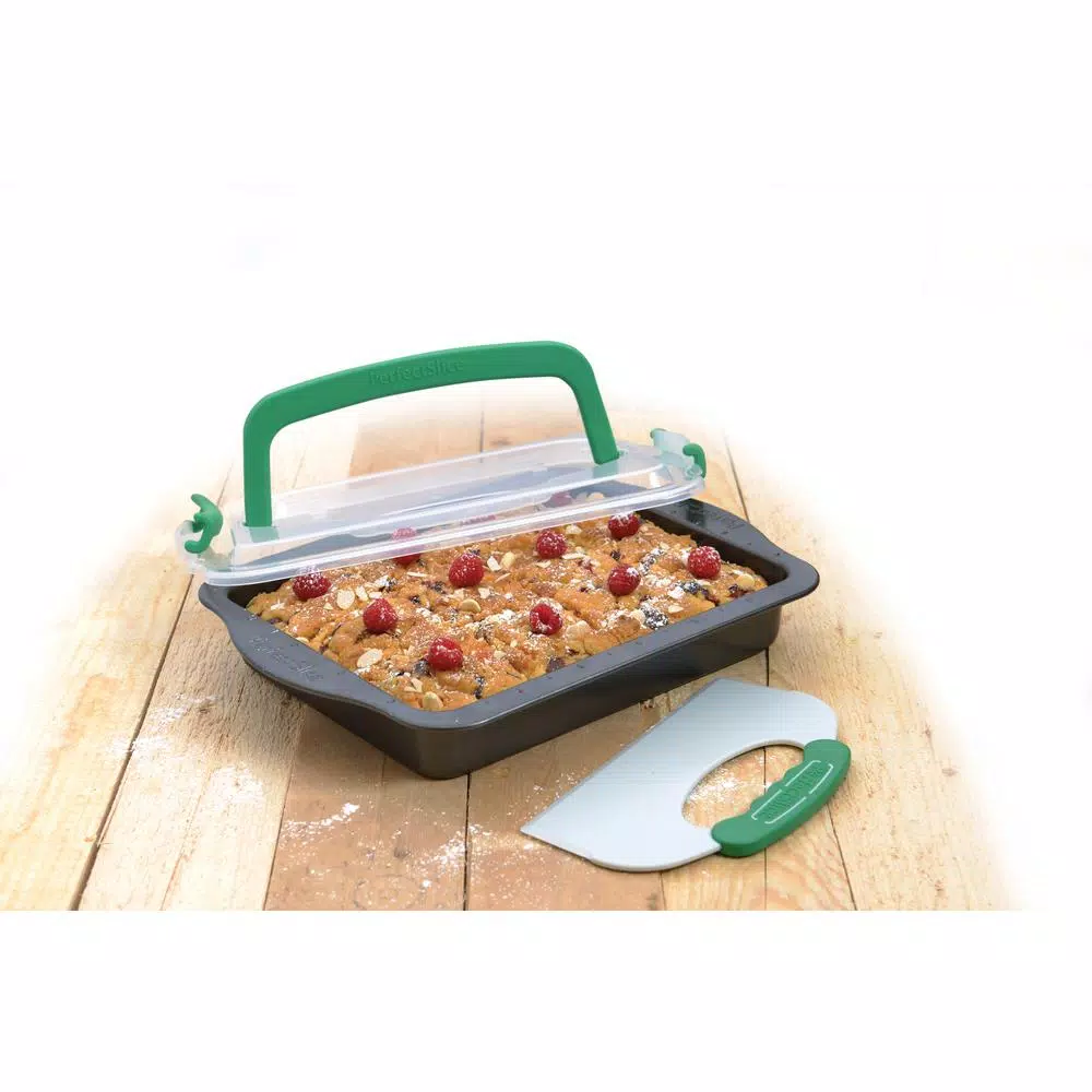 Includes Perfect Slice 14 in. x 11 in. Cookie Sheet with tool and 9 in. x 13 in. Covered Cake Pan with Tool. The unique patented guideline grid around the outer edges of every pan allows you to simply line up an exclusive Perfect Slice cutting tool and press down to create any portion size desired. Every slice is beautifully uniform. The cutting tool with silicone handle is tough enough to cut the cake yet wonβt damage your pan. Oven Safe up to 482Β°F.