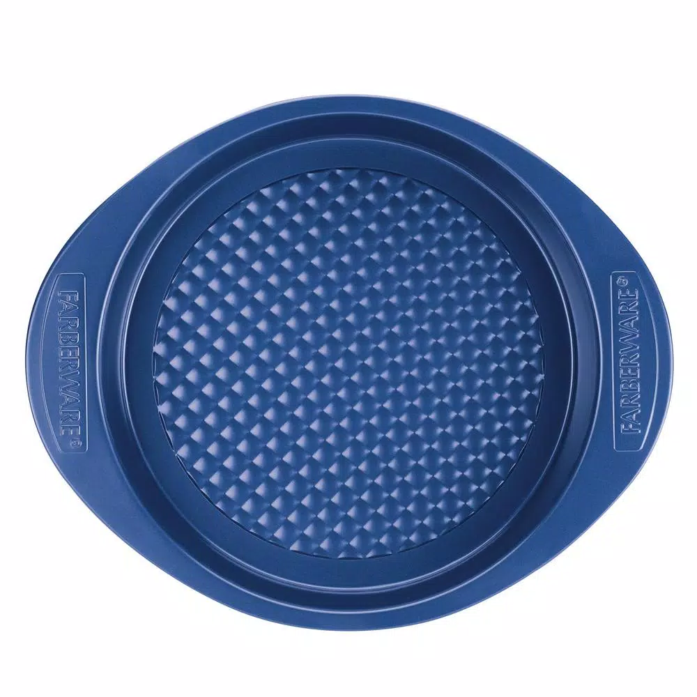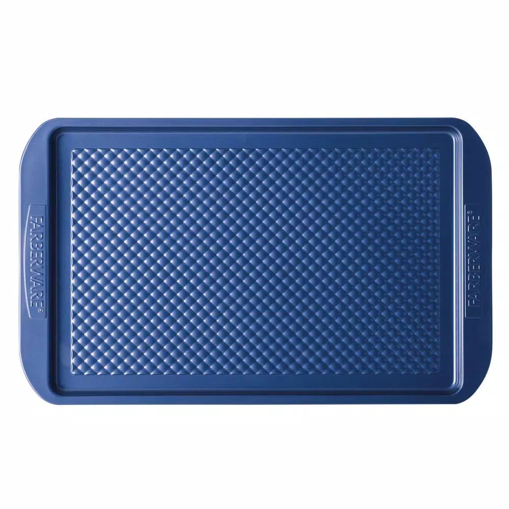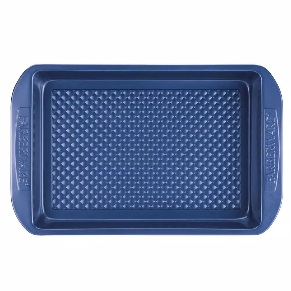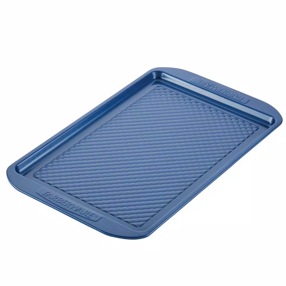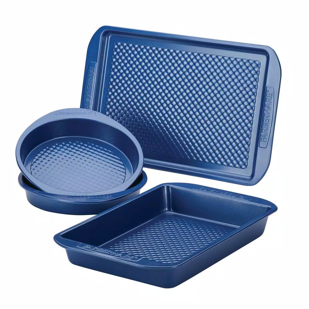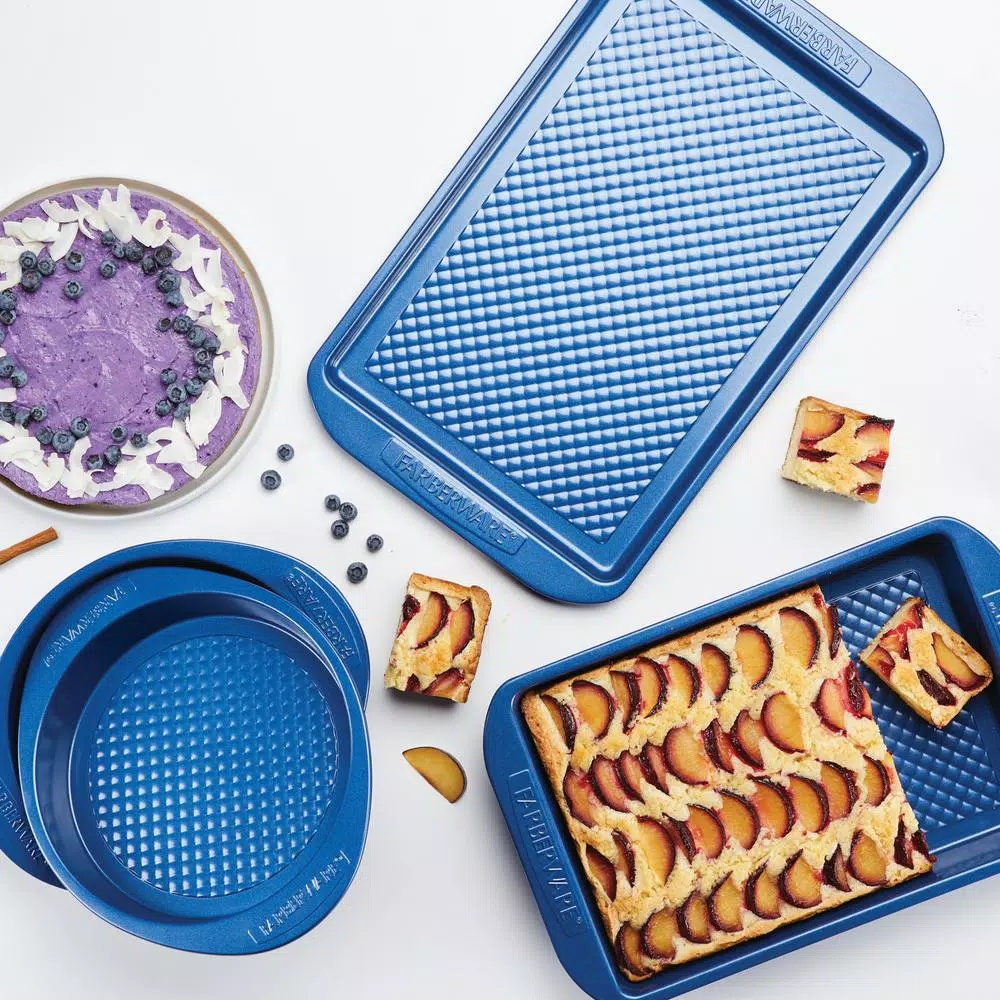 Say goodbye to dull and uninspiring bakeware with the Farberware Colorvive 4-Piece Nonstick Bakeware set. Boasting a vibrant, metallic-colored nonstick coating, this muffic pan delivers glitzy great looks along with durable, warp-resistant steel construction. Perfect for a batch of chewy fudge walnut brownies, a double-layered lemon lavender and rosemary cake with vanilla bean frosting or a zesty Florentine spaghetti bake, the high-quality nonstick provides long-lasting food release with easy cleanup. A quilted baking surface boosts airflow for balanced baking and easy browning, so buttermilk cornmeal bread gets golden brown without leaving its crust behind. Oven safe to 450Β°F for near-endless recipe compatibility, the bakeware features rolled rims and wide handles for a comfortable grip to pull hot and heavy banana breads and zuchinni cakes out of the oven, and the pans are dishwasher safe for convenient cleaning, although hand wash is reccomended. Focus the bright beam of high-performance on visually stunning bakeware with the Farberware Colorvive 4-Piece Nonstick Bakeware set and leave the dull pans behind.