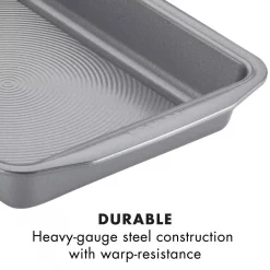 βDepend on nonstick bakeware designed to deliver baked goodness with the sturdy, reliable Circulon Nonstick Bakeware 9 in. x 13 in. Rectangular Cake Pan. Superior nonstick technology and solution-driven design set Circulon bakeware apart from other nonstick bakeware. The technology begins with raised circles on the cake pan surface that boast premium nonstick. The rolled-rim design includes distinctive chocolate brown color inside and out, and wide handles for plenty of grip, even with bulky oven mitts. Oven safe to 450Β°F, this bakeware brings the Circulon kitchen-time-and-energy-saving approach to baking home. And with a Hassle-Free Lifetime Guarantee, the cake pan truly delivers for the well-rounded life. Take the cake pan, one designed for delicious, dependable nonstick baking every time, with the efficient, stylish Circulon Nonstick Bakeware 9 in. x 13 in. Rectangular Cake Pan.