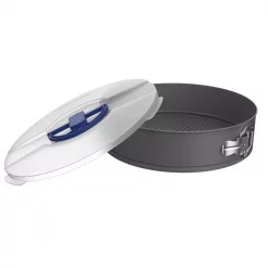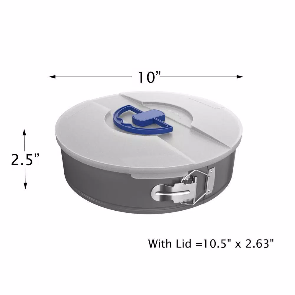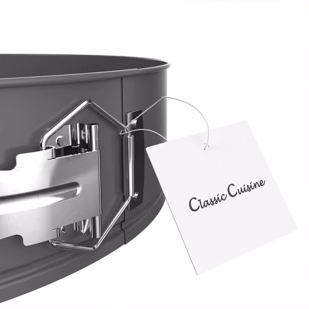The 2-Piece 10 in. Nonstick Springform Cake Pan and Lid Set by Classic Cuisine is a kitchen necessity for every home baker. With a snap down lid included with the pan to keep your cheesecakes, coffee cakes, or tortes fresh on the go, this spring form pan is conveniently travel friendly. The 10-inch round pan is constructed from Carbon-Steel and features folded edges to prevent warping, and a nonstick coating for easy release of any baked goods. This high-quality set is essential bakeware for your home and will also make a fantastic and thoughtful gift for birthdays, holidays, housewarmings, weddings, graduations, or any occasion.