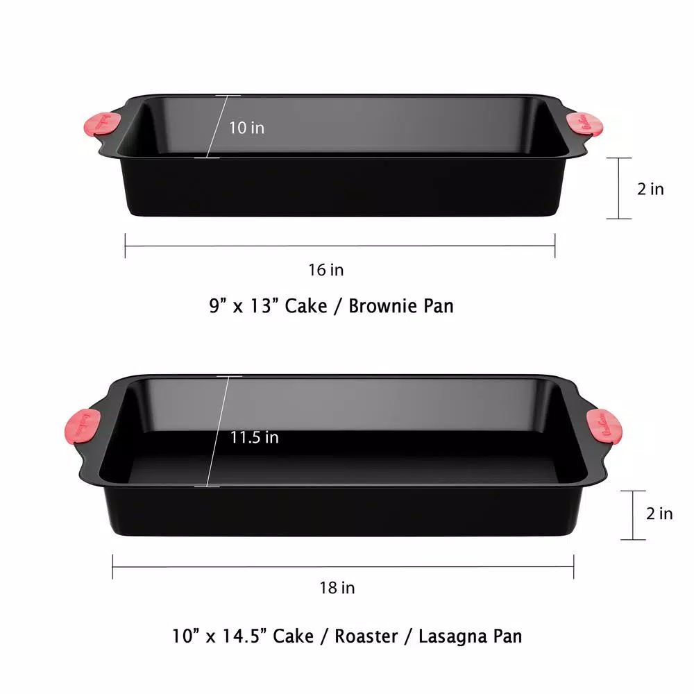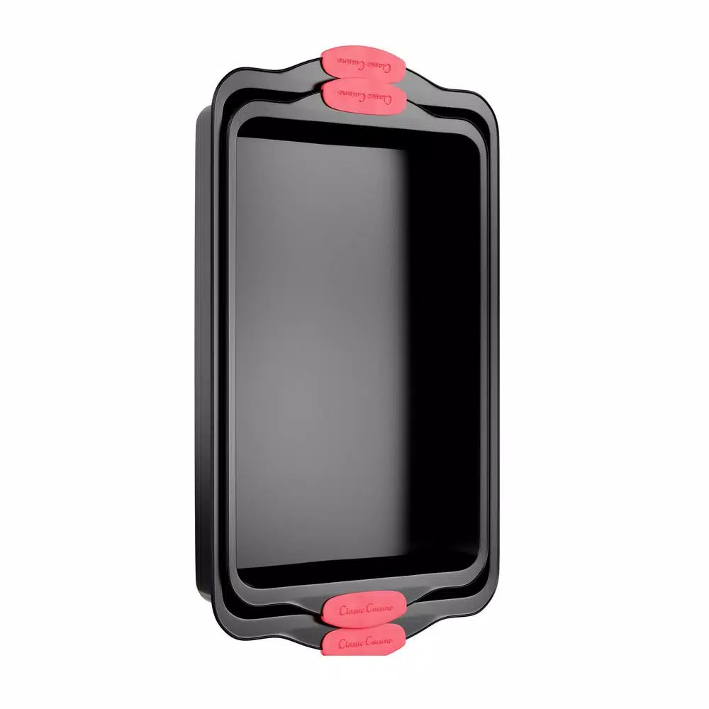 The 2-Piece Baking Pan Set by Classic Cuisine is a kitchen necessity for every home cook. With a large 9 in. x 13 in. pan for cakes, bars or brownies and a 10 in. x 14.5 in. pan for roasts, lasagnas or veggies, this versatile cookware is perfect for every recipe. The silicone handles provide a safe and secure grip when pulling the hot pans from the oven, while the nonstick surface ensures that none of your delicious dinners and desserts will get stuck to the pan. These well-crafted and durable rectangle baking pans are essential bakeware for your home and will also make a fantastic and thoughtful gift for birthdays, holidays, housewarmings, weddings, graduations or any occasion.