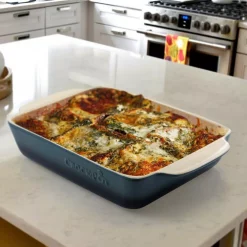 Bake and serve your best dishes with the Crock-Pot Artisan 4 Qt. stoneware bake pan in blue. The stoneware make allows for oven based meals. Cook savory feasts for guests like lasagna, mac n cheese, and stuffed chicken. The casserole dish is microwave safe so you can reheat leftovers and bring the pan straight to the table. Itβs also dishwasher safe for easy cleaning after dinner.