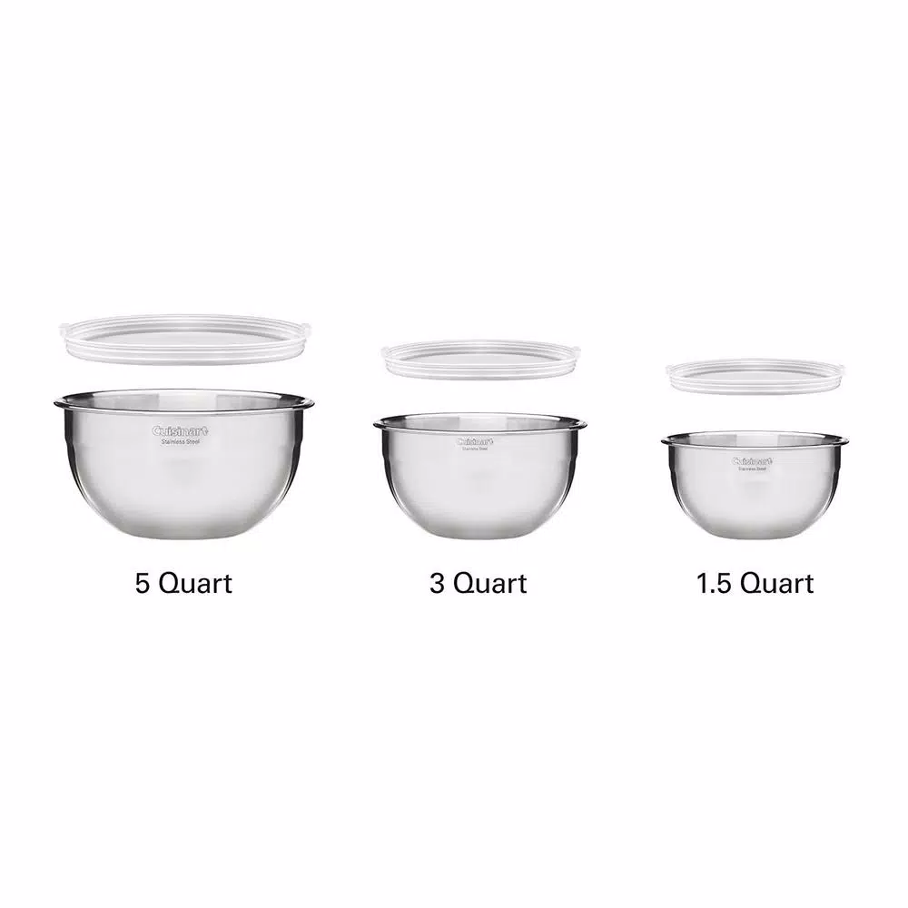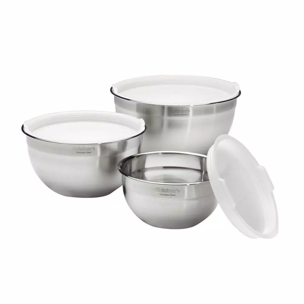 The Cuisinart CTG-00-SMB Stainless Steel Mixing Bowls nest to save space and have lids to store leftovers in refrigerator or freezer. Three sizes handle any task that requires a bowl. These are dishwasher safe.