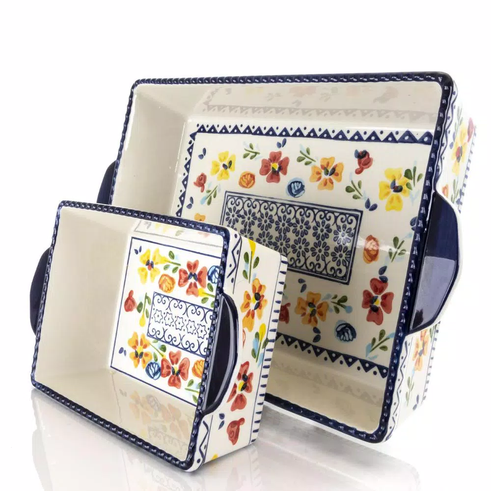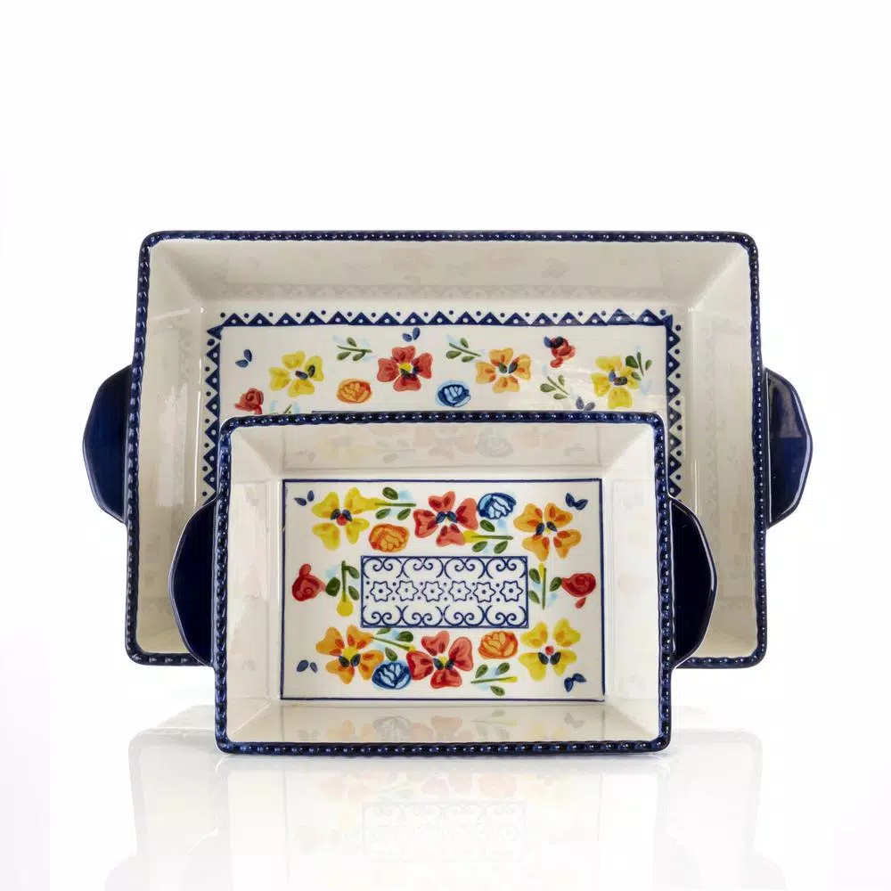 The GIBSON elite Luxembourg 2-piece rectangular stoneware bakeware set enhances the presentation of dinners, desserts and more. This classic set features beautiful floral designs in bright colors along with an intricate blue design along the rim. The stoneware construction can withstand oven high temperatures and is dishwasher safe for effortless cleanup. This pair is also microwave safe for fast reheating of leftovers. The pieces can be used for baking, serving and storing foods. Bake a delicious lasagna, peach cobbler, savory casseroles, fish, chicken or any other dream dish. The European design makes these pans presentable enough to go from oven to the dinner table.