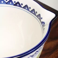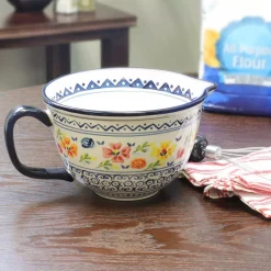 The Luxembourg Batter Bowl is a delightful addition to your kitchenware and a true piece of art. The beautiful flowers mingling with Mandala-esque hand painted blue designs make this batter bowl a practical yet artistic statement. This durable and exquisite bowl features a handle for effortless mixing and a spout for easy pouring.