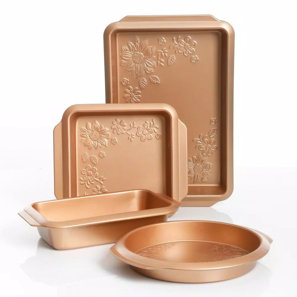 This beautiful Copper non-stick Carbon Steel Set will bring a touch of home to all of your baked goods. The elegant floral embossed design is sure to make a statement in your home kitchen. Not only is this set beautifully decorated, itβs heavy gauge steel build and non-stick surface makes for a truly reliable and convenient kitchen tool. This set is perfect for all kinds of baking from cakes, cookies, breads, and other pastries. Ideal for savory and dinner dishes as well.
