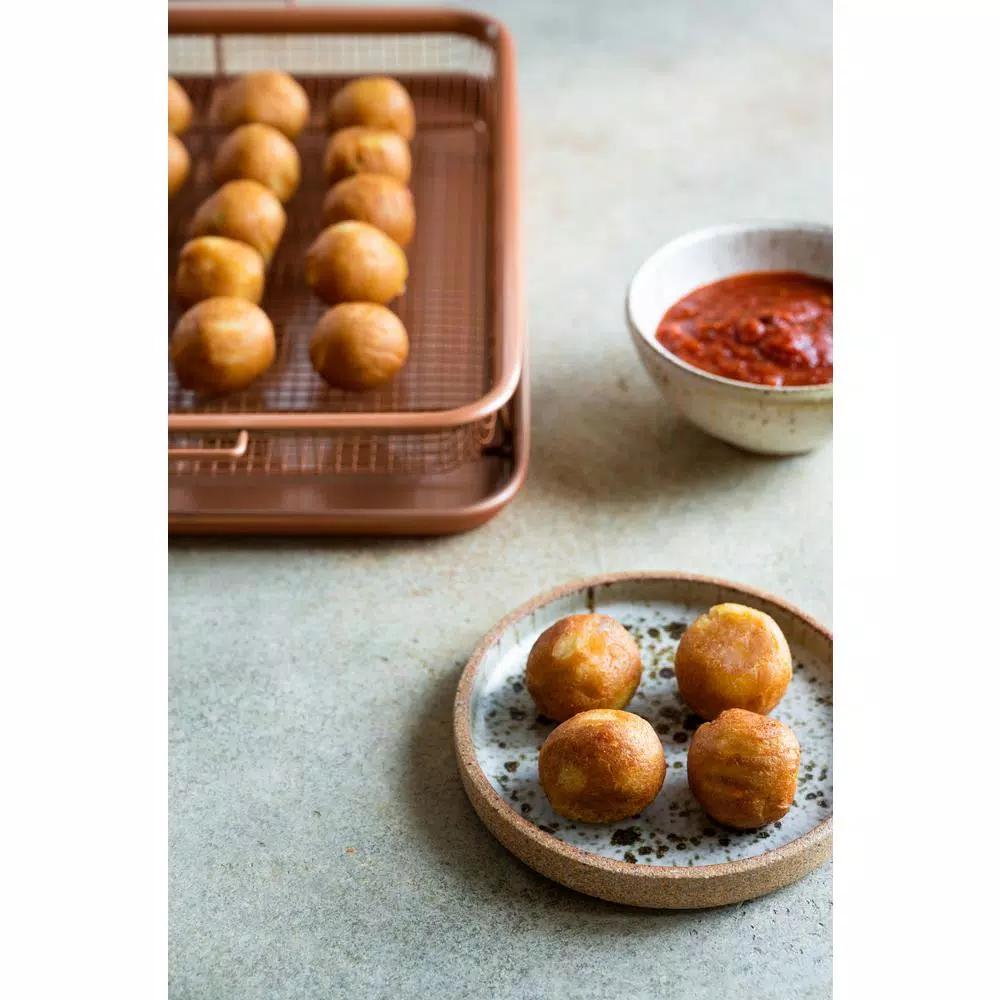 The Amazing Gotham Steel Crisping Fryer That Works in your Oven. Get the crunch & crisp you cant resist without added oils or fat. Unique elevated nonstick tray allows superheated air to pass through & circulate around all 360 degrees of your food for the perfect crisp & brown all around.