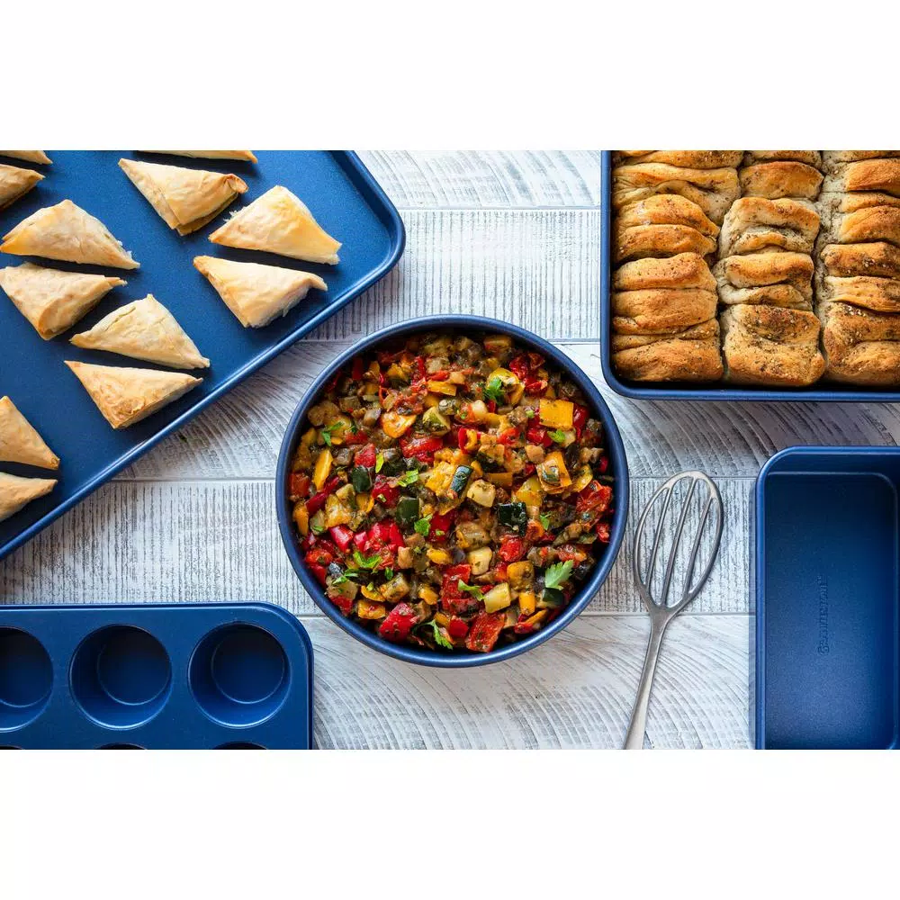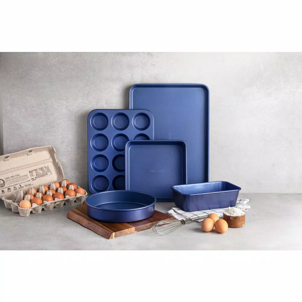 - Set includes: 9.5 in. square baking pan, muffin pan for 12-muffins, 9.5 in. round baking pan, 9.7 in. x 5.75 in. loaf pan, 17.7 in. x 12.7 in. cookie tray