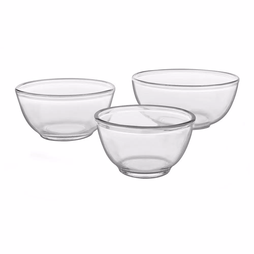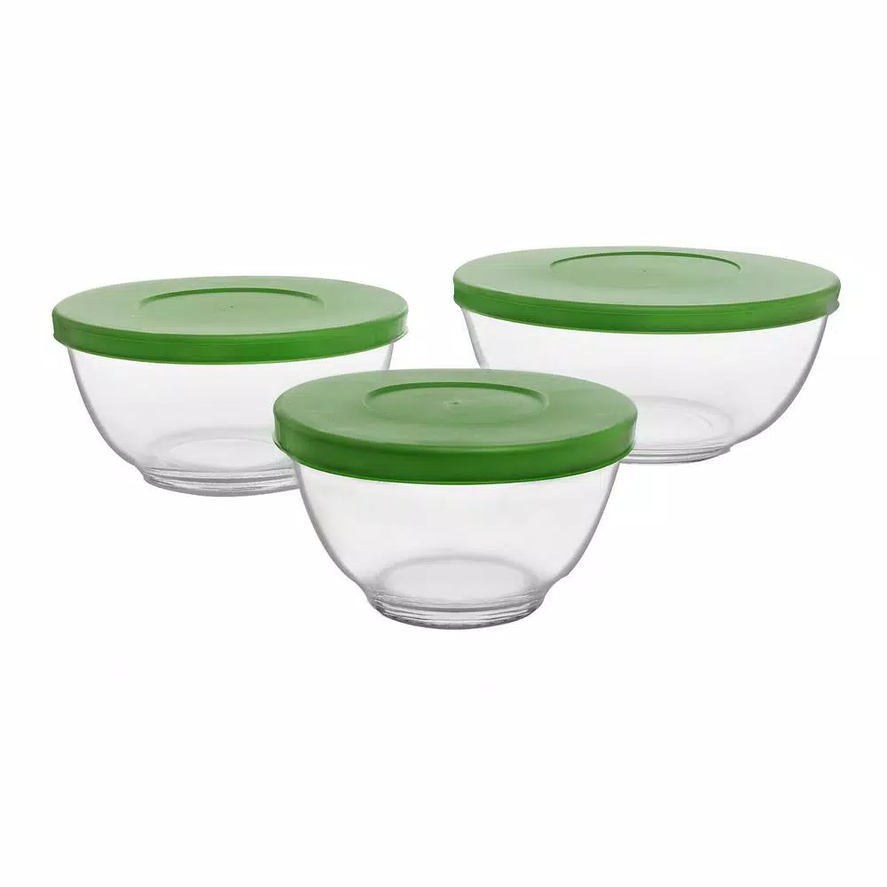 - Includes 1, 1 Qt. glass mixing bowl with plastic lid; 1, 2 Qt. glass mixing bowl with plastic lid; and 1, 3 Qt. glass mixing bowl with plastic lid