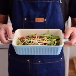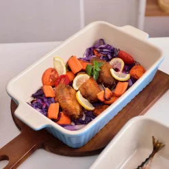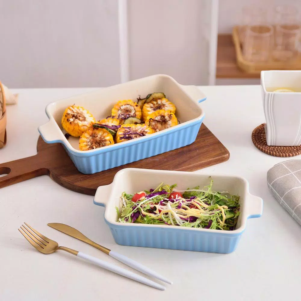 There is no denying the fact that delicious food is one of the most prominent weakness of everyone. A plate full of exquisite dishes is something which people even dream about in their sleep. And if you are foodie then what to say more, food lovers donβt eat to live. Rather they live to eat delicious food or dishes. So exquisite bake ware pans are important part to their attention. Rectangle blue porcelain baking pans including 9 in. and11 in. bake ware pans. porcelain Bake dishes at different sizes and functions fit for most food in daily life.