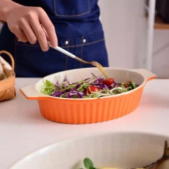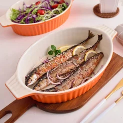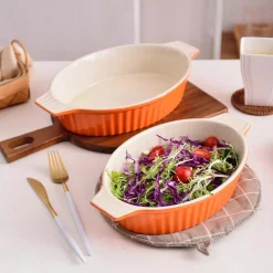 There is no denying the fact that delicious food is one of the most prominent weakness of everyone. A plate full of exquisite dishes is something which people even dream about in their sleep. And if you are foodie then what to say more, food lovers donβt eat to live. Rather they live to eat delicious food or dishes. So exquisite bake ware pans are important part to their attention. Oval orange porcelain baking pans including 12.75 in. and 14.5 in. bake ware pans. Porcelain Bake dishes at different sizes and functions fit for most food in daily life.
