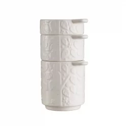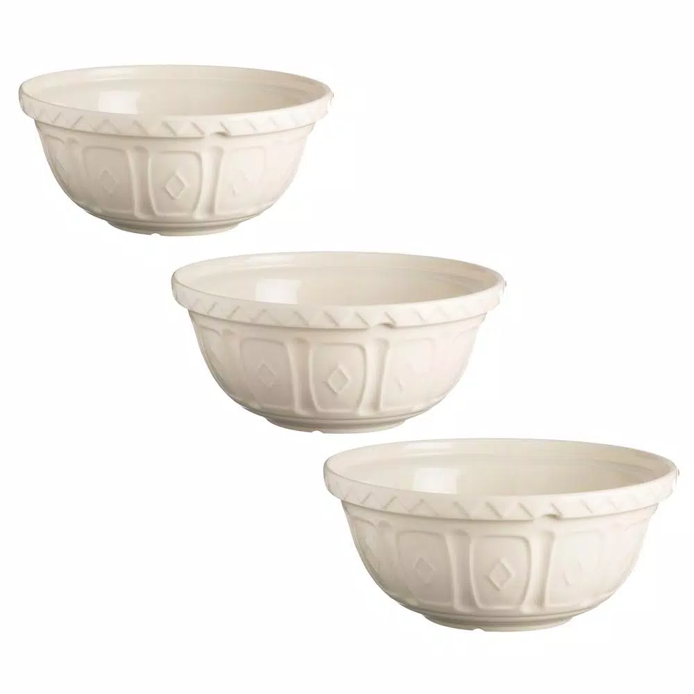 Stir some colour into your kitchen with the Mason Cash Colour Mix mixing bowl range. The Set of 3 Cream mixing bowls retain the charm of Mason Cash classics whilst bringing a bright, vibrant palette to any kitchen. Made from chip resistant earthenware, the bowls counters the tendency to move during manual mixing and the patterned exterior helps grip the bowl.
