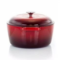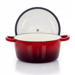 The MegaChef Round Enameled Cast Iron 10.25 in. Casserole in Blue makes f or an ideal cooking essential f or any home kitchen. Made of durable enameled cast iron f or proper longevity. The cooking potβs enameled non-stick surface allows f or easier and healthier cooking by cutting back on oils and fats. Get the most flav or out of meats and sauces with the self basting lid and keep the heating process going non-stop. The potβs lovely gradient of col or brings life through out the kitchen and dinner table. Never fret over acidic ingredients, the cookwareβs enameled coating protects the cast iron material while providing all the benefits of it. Take full advantage of this casserole dish to create delightfully thick soups, an immaculate pot roast or an incredible pot of chili.