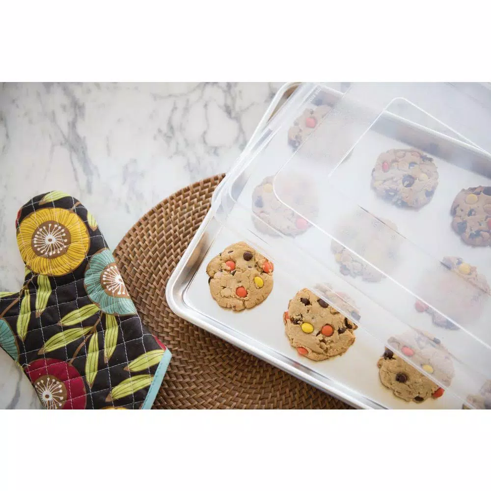 A true kitchen must-have, the Bakerβs Half Sheet is our signature Naturals piece. Make storage and transport a snap with a lid that lets you take your baked goods anywhere. Professional pastry chefs and bakeries bake on aluminum for consistently perfect results. You can do the same with our commercial quality Naturals Bakeware collection. Made of pure aluminum, these premium pans will never rust and they produce evenly browned baked goods every time. Encapsulated galvanized steel rims prevent warping.