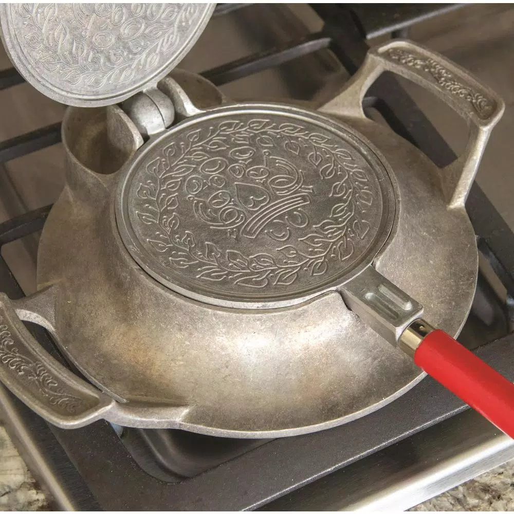 Create traditional Scandinavian, Italian cookies and cones with Krumkake and Pizzelle Iron. Krumkake is a thin, delicate embossed cookie of Norwegian origin. It is typically rolled into a cone while still warm and flexible and filled with whipped cream or fruit. A Pizzelle is a traditional Italian sugar cookie. Hinged ironβs holder is heated on stove burner after iron has been preheated, batter is added and cooked briefly on each side by rotating the iron. Remove cookie and roll it around cone while warm to form a beautiful and delicious treat.