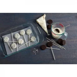 - Glass bakeware has large ergonomic handles for improved handling