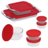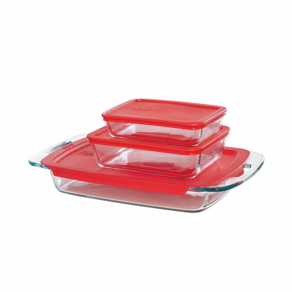 - Easy grab 4-piece set includes 2 Qt. and 3 Qt. oblong baking dishes with red plastic covers