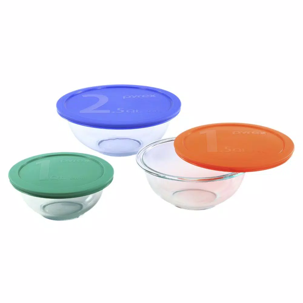 Food prepare is as easy as 1-2-3 with this Pyrex set. It includes three different sized glass bowls, each with a different colored lid. You’ll love the way they look in your cabinet, fridge or freezer. And you’ll love how the secure-fitting lids keep foods fresher longer. This 6-piece Mixing Bowl Set includes one each: 1 Qt., 1.5 Qt. and 2 Qt. glass bowls with blue, orange and green plastic lids.