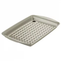 Take the guesswork out of assembling an essential bakeware collection with the versatile Rachael Ray 10-Piece Silver Nonstick Bakeware Set. Featuring seven baking pans in six popular sizes, this practical set can handle cakes, zesty lasagna, meatloaf, roasted rosemary potatoes, brownies and more. Made from heavy gauge steel, the pans resist warping and feature long-lasting nonstick in a beautiful silver color that provides excellent food and baked good release with easy cleanup. Enjoy the convenience of a bakeware set that helps create everything from Rachaelβs Eggplant Parm and Four Cheese Baked Pasta to her Almond Joy Layer Cake or Espresso Brownies, and take your goodies on the go with the convenient covered cake pan. Rolled-rims provide a confident grip for easy handling, even with bulky oven mitts on, and the set is conveniently oven safe to 450F (plastic cake pan lid not intended for oven use). The loaf pan includes a convenient insert for pulling out the perfectly shaped meatloavs and banana breads, and the large cookie pan includes a cripser insert for getting great golden browns on everything from french fries to roasted fall vegetables. These versatile baking pans are the perfect complement to many other pieces in Rachaelβs bakeware and cookware collections that always spell fun in the kitchen. Although dishwasher safe for a quick cleanup, handwashing is recommended for the best and longest lasting performance.