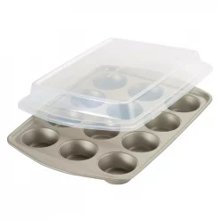 Grab the goodies and go with the Rachael Ray 3-Piece Silver Nonstick Bakeware Set that includes an innovative swing lid for covering baked goods, sides, and more. Made from heavy gauge steel, the pans resist warping and feature long-lasting nonstick that provides excellent food and baked goods release with easy cleanup. Enjoy the convenience of a bakeware set that helps create everything from Rachaelβs Eggplant Parm and Four Cheese Baked Pasta to her Almond Joy Layer Cake or Espresso Brownie Cup Cakes, and keep the feast fresh with the convenient swing lid that can cover both pans for countertop storage or to take cakes, casseroles, and muffins on the road to parties and get togethers. Rolled-rims provide a confident grip for easy handling, even with bulky oven mitts on, and the set is conveniently oven safe to 450F (plastic cake pan and cupcake pan lid not intended for oven use). These versatile baking pans are the perfect complement to many other pieces in Rachaelβs bakeware and cookware collections that always spell fun in the kitchen. Although dishwasher safe for a quick cleanup, hand washing is recommended for the best and longest-lasting performance. Turn up the heat and bake some excitement with the Rachael Ray 3-Piece Silver Nonstick Bakeware Set.