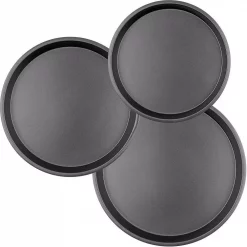 Southern Homewares loves to help out around the kitchen and the 3-piece round baking pan set is sure to do just that, with a non-stick coating these pans are the perfect companion for your next culinary masterpiece. They are perfect for cooking tiered cakes, baking cookies, making deep dish pizza or even oven roasting meats like chicken or bacon. When non- in use they can stack inside each other to help save valuable cabinet space. Set includes three pans. One with an 8 in. Dia and a 0.80 in. depth, one with a 9 in. Dia and a 0.88 in. depth, and one with a 10 in. Dia and a 0.90 in. depth. Pan walls and bottoms are 0.02 in. thick. Overall set dimensions are 10.63 in. x 10.63 in. x 1.27 in.