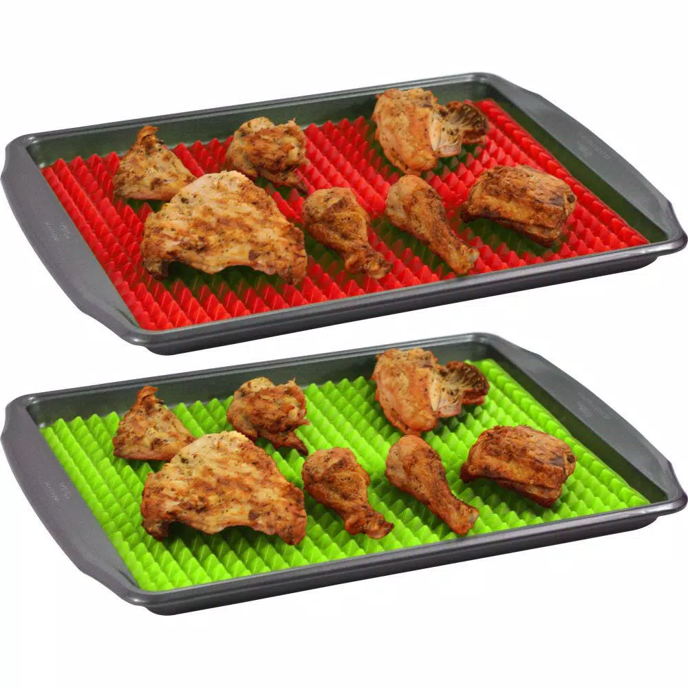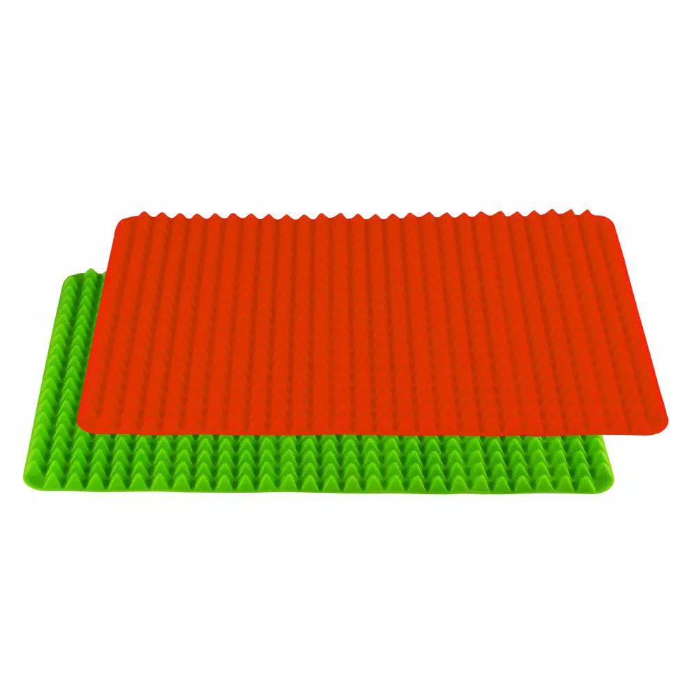 The Healthy Homewares Silicone Baking Mat is the perfect companion for any kitchen. This generously sized mat is composed of 556 small raised triangles that allow the fat and grease to just drip away while cooking. This ensures crispier, juicier, and overall more healthy servings. Made of Silicone, the mat has a nonstick cooking surface and is also dishwasher and microwave safe. The mat can be easily folded or rolled up for compact storage. Overall dimensions when laid flat are 15.875 in. long 11.31 in. wide and 0.4 in. tall, but can simply and quickly be cut down to fit any smaller sized tray or pan. Comes with two baking mats. One mat is red, one mat is green.