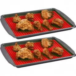 The Healthy Homewares Silicone Baking Mat is the perfect companion for any kitchen. This generously sized mat is composed of 556 small raised triangles that allow the fat and grease to just drip away while cooking. This ensures crispier, juicier, and overall more healthy servings. Made of Silicone, the mat has a nonstick cooking surface and is also dishwasher and microwave safe. The mat can be easily folded or rolled up for compact storage. Overall dimensions when laid flat are 15.875 in. long 11.31 in. wide and 0.4 in. tall, but can simply and quickly be cut down to fit any smaller sized tray or pan. Comes with two baking mats.