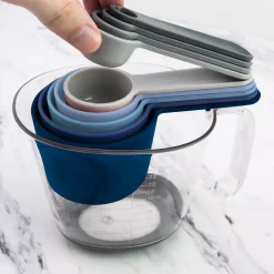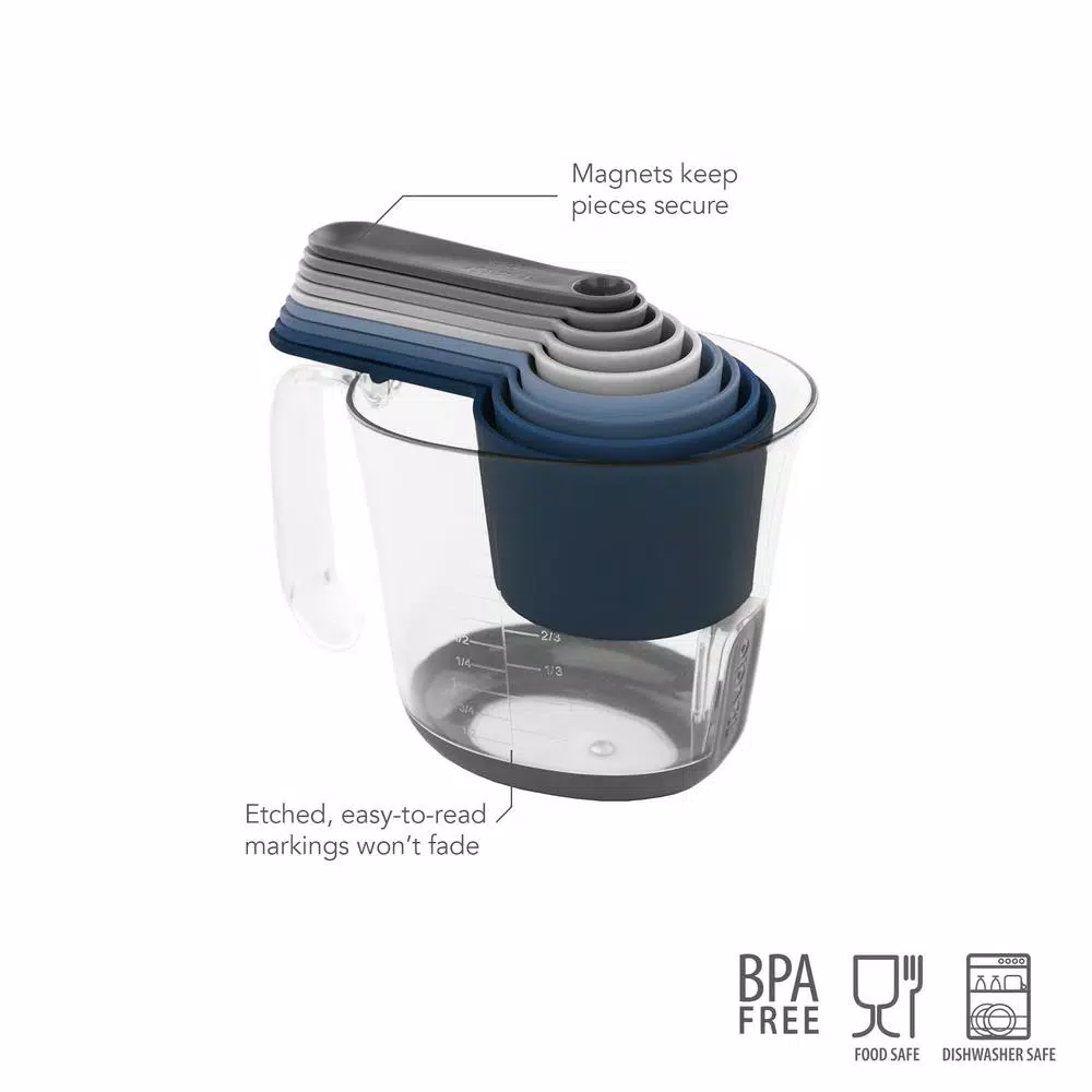 Never search for lost measuring cups and spoons again with the Magnetic Nested Measuring System from Tovolo. This complete set stacks neatly within itself for compact storage. With a variety of measuring tools for both dry and wet ingredients. Dry measuring cup set includes 1/4, 1/2 and 1 tsp; 1 and 2 Tbsp, 1/4, 1/3, 1/2 and 1-cup measuring pieces. Smooth interior makes it easy to measure accurately. Wet measuring cup holds up to 3-cups of liquid. Wet measuring cup features cup, mL and ounce markings to help you measure wet ingredients accurately without difficult conversions. Measuring cups and spoons nest for compact storage. Magnets in the handles of the measuring spoons and cups keep the items nested without falling or tipping. Easily grab the measuring tool you need without rings. Easy-to-read markings wonβt fade over time. Measurements are etched into the measuring tools to ensure they can be read with ease and wonβt fade in the dishwasher. Spoons and cups feature mL measurements as well as cups. Etched, easy to read markings will not fade over time. Dry measuring cup set includes 1/4 tsp, 1/2 tsp, 1 tsp, 1 Tbsp, 2 Tbsp, 1/4 cup, 1/3 cup, 1/2 cup, 1 cup and 3-cup measuring pieces. Measuring set is perfect for baking beginners or housewarming gifts. Made of BPA-free plastic with embedded magnets. Do not place measuring cups in microwave.