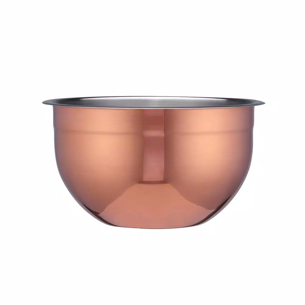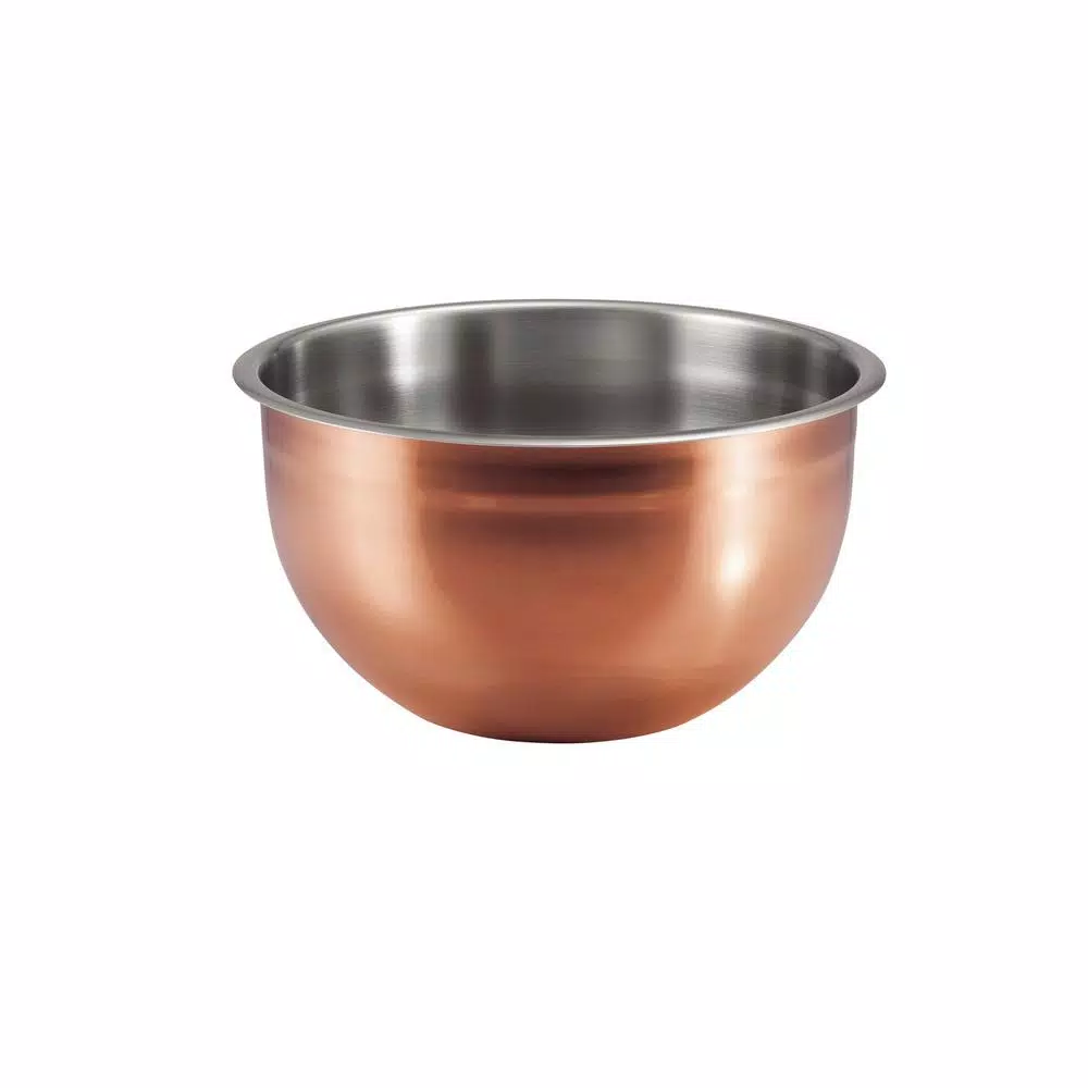 Prep and serve in style with Tramontinaβs heavy-gauge Copper Clad Mixing Bowl. The bowl is ideal for mixing ingredients, whisking eggs, kneading dough, or storing and serving food. The bi-ply clad construction consists of a premium 18/10 stainless steel interior with a beautiful copper exterior that adds a touch of elegance to your kitchen and dining table. The mixing bowl is durable, functional, beautiful, and is also designed to conveniently nest for compact storage. Hand-wash only. Lifetime Warranty.